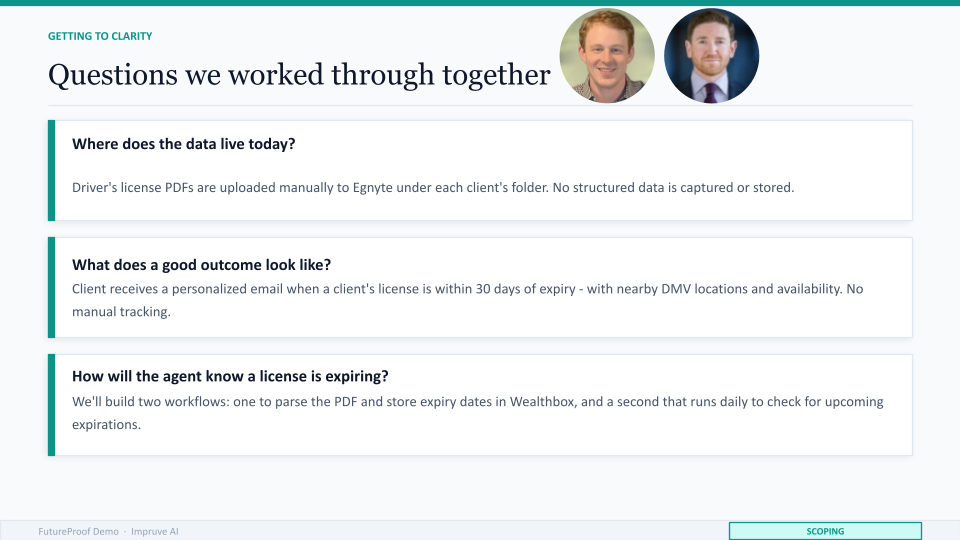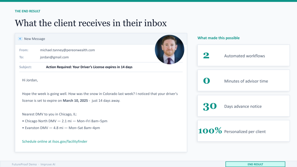 The goal we scoped together: when a client's license is within thirty days of expiry, they receive a personalized email, with nearby DMV locations and available times, sent automatically, with zero manual effort from the advisor.