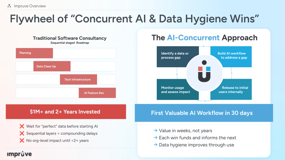 The Impruve Approach: Concurrent Wins (Actionable Workflows + Data Infra)
