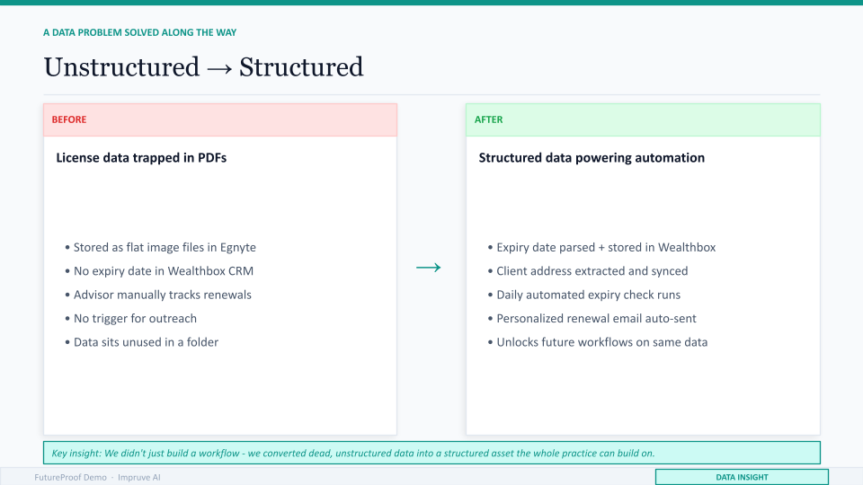 After workflow one ran, that same data became a structured asset. Expiration dates in Wealthbox. Addresses extracted and synced. A daily check running against clean, structured fields. And the same data that powers the license reminder can now power the next idea, whether that is an address change detection check, a beneficiary review prompt, or any number of downstream workflows that require knowing where clients live and when their documents are current.