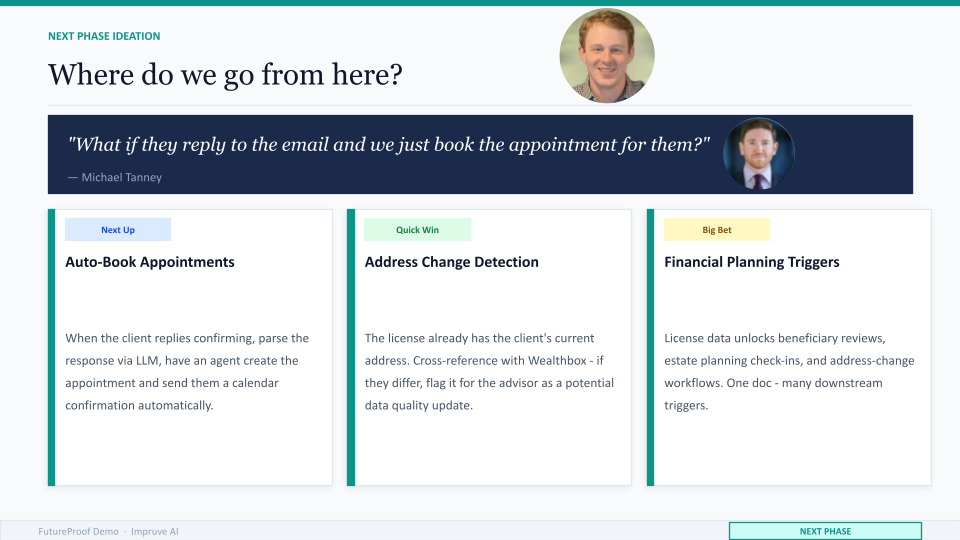 We are grateful to Future Proof for the platform and to Michael Tanney for being the kind of client who thinks out loud and lets us build with him in public. We are even more grateful to the advisors in that room who took the Q&A seriously and shared what is actually on their wish lists.