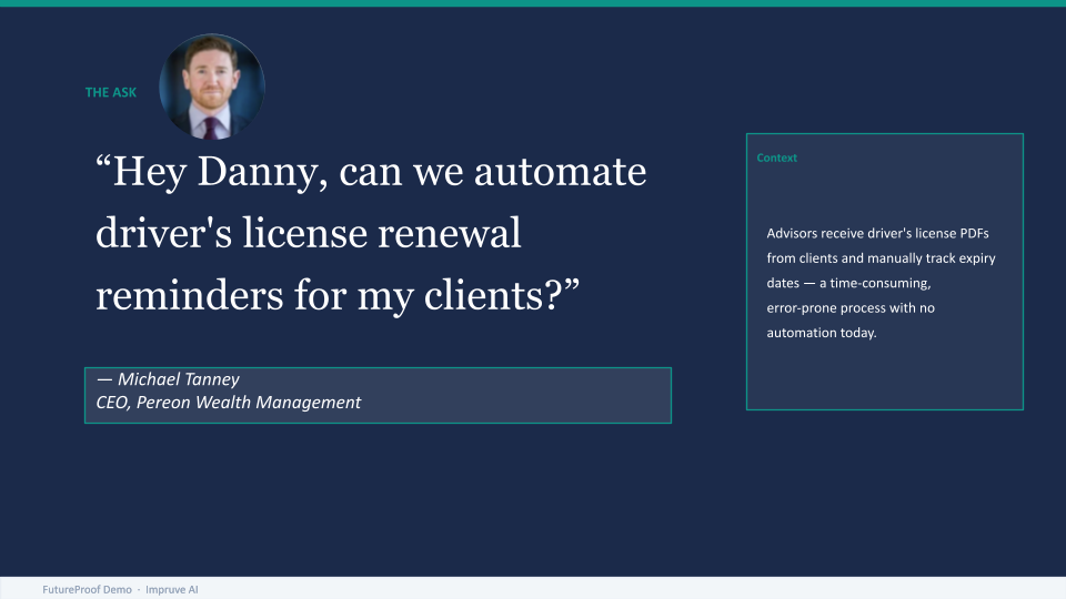 Here is the wish list item Michael brought to us: every new client goes through a KYC process. That means collecting a driver's license. Those licenses sit in Egnyte, filed under client folders. There is an expiration date on every one of them. Nobody at the firm tracks it. The client eventually figures it out, usually later than they should.